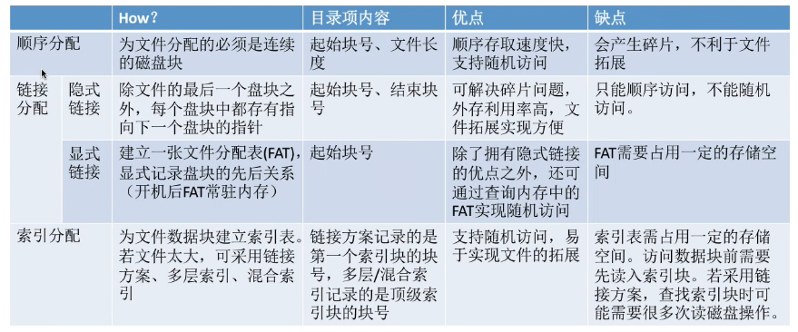 链接分配 显示链接 引入一个FAT(文件分配表 常驻内存) 存放(物理块号,下一块)的信息 好处在