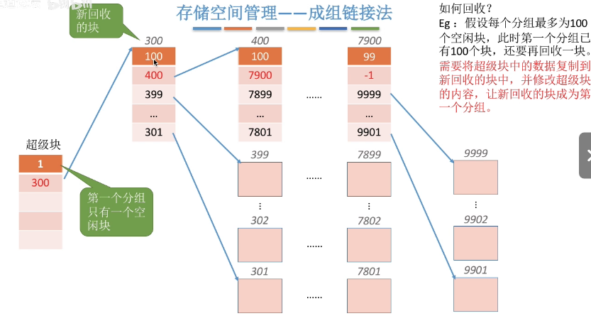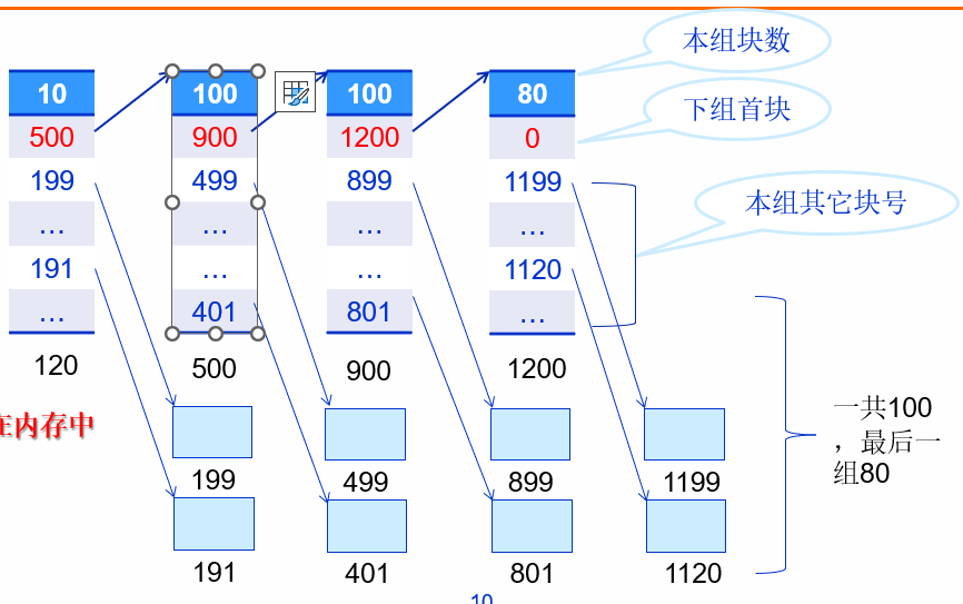 每一组的第一个要存放 1:下一组的盘块数量 2:存放的盘块号